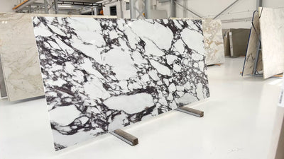 Viola is inspired by the luxurious Italian marble Calacatta Viola, showcasing rich dark purple hues and bold, boulder-like veining. Its dramatic, sophisticated design adds a refined statement to any space.
